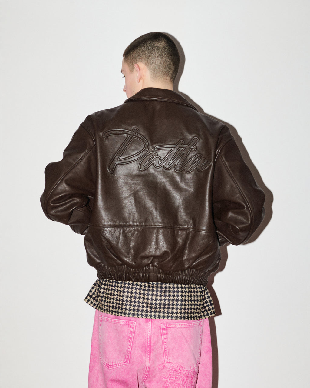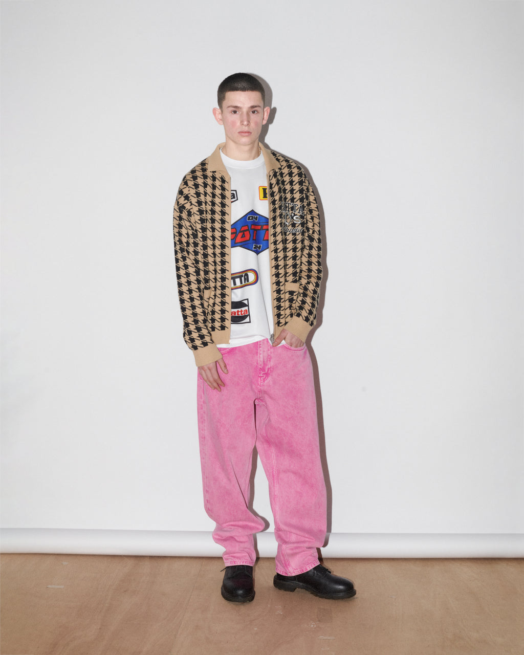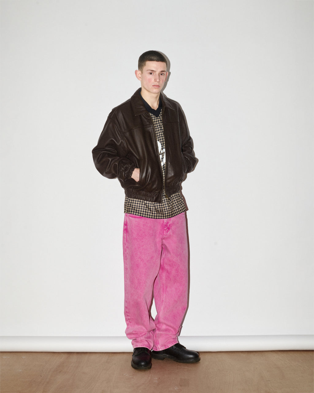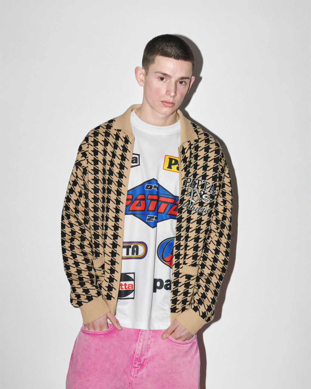 jackets and a reinterpreted varsity featuring leather houndstooth sleeves. The houndstooth motif returns on jerseys and knitted zipped vests.